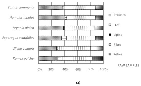 Mediterranean wild vegetables are important sources of nutrients [5,6] and bioactive compounds [7,8,9,10,11], which are totally preserved when they are consumed in the fresh form. However, as with cultivated green vegetables [12,13,14,15], some species must be consumed after culinary treatments with different cooking techniques, such as boiling, frying, mixing with other ingredients in stews or other elaborations [16,17], as in the case of Rumex pulcher L., Silene vulgaris (Moench) Garcke. leaves, and Asparagus acutifolius L., Brionya dioica Jacq., Humulus lupulus L., Tamus communis L. young shoots, which could have an important effect on their nutritional composition. These processes are frequently necessary to improve their edibility and/or to remove undesirable compounds, such as oxalic acid; while in other cases, the process is part of the traditional behavior of its consumption. In black bryony (T. communis) and white bryony (B. dioica), some toxic compounds (saponins and triterpene glycosides, respectively), or some ribosome inactivating proteins, can be found in different parts of the plant, such as fruits and subterranean tubers, and the cooking process traditionally applied to the edible parts of these species may reduce those toxic substances, by either solubilization into cooking liquid or heat degradation [18,19,20,21,22].