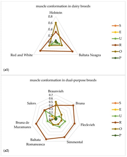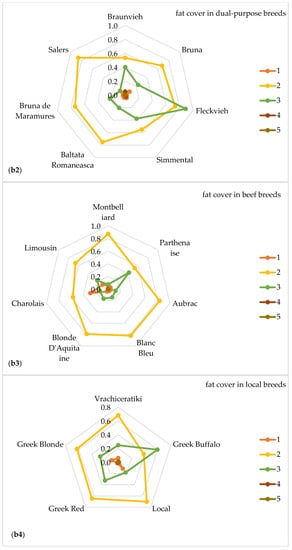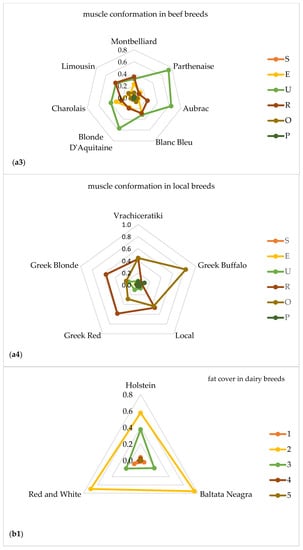 Figure 1 shows the distribution of frequencies of classes for muscle conformation (a1–a4) and fat deposit (b1–b4) scores given as explanatory spider web charts in grouped breed types of dairy (a1,b1), dual purpose (a2,b2), beef (a3,b3) and local (a4,b4) cattle breeds, respectively.
