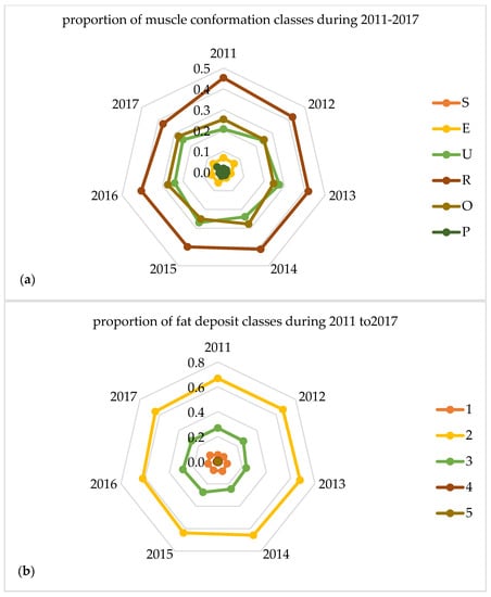 Proportion of muscle conformation (a) and fat deposit (b) classes for the carcasses during 2011–2017.