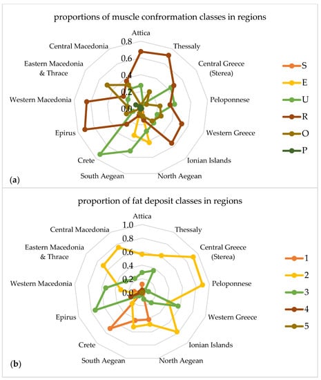 Figure 3 given as explanatory spider web charts depicts the proportion of muscle conformation (a) and fat deposit (b) classes in the 13 regions of the country.