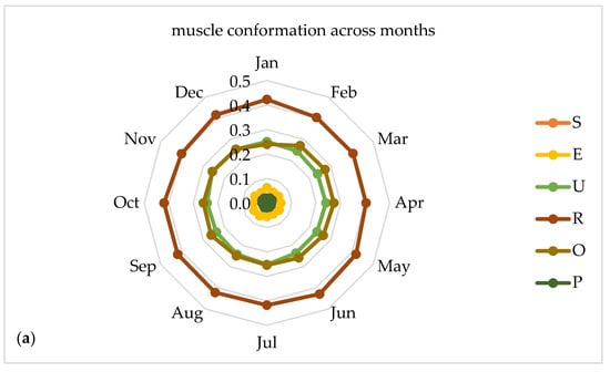 In Figure 4 given as explanatory spider web charts, the distribution of conformation classes is homogeneous across the months and the highest proportion of muscle conformation in class R is widespread all over in the 12 months. Similarly, regarding the fat cover the highest proportion of fat deposit is classified in class 2.