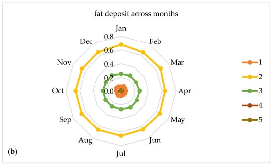Proportions of muscle conformation (a) and fat deposit (b) classes distributed across 12 months.
