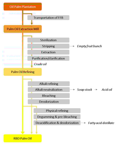 The oil refining processes can be classified as chemical and physical, which mainly differs by the technology used for FFA removal. For physical refining, FFAs are removed by distillation process during deodorization, which in this case, phosphatides and other impurities must be eliminated before steam distillation []. In chemical refining, most of the impurities in the FFA are removed with an alkaline solution during neutralization, usually using sodium hydroxide (NaOH) []. An overall summary of the palm oil refining process is an example of vegetable oil processing and depicted in Figure 1 [,,,].