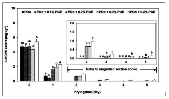 Degradation of 3-chloropropane-1,2-diol (3-MCPD) esters in palm olein (POo) added with polyglycerol fatty acid esters (PGE) during repeated frying. The 3-MCPD esters for frying times between day 2 and day 5 can be referred to in the magnified section to improve clarity. One-way analysis of variance (ANOVA) was used to indicate the significant difference between the control experiment (POo without PGE) and each frying interval (p < 0.05), as shown by different lowercase letters [].