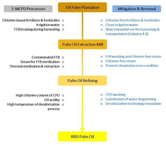 Other ways to control and minimize the 3-MCPD occurrence in the oil palm plantations is to shorten and optimize the transportation distance between plantation area and milling site []. Industry experts suggested that the palm oil milling process for CPO production should be within 48 h to maintain minimum DAG (or FFA) content in the oil []. Furthermore, the industry should adopt innovations and mechanizations in oil palm harvesting and transportation in the plantation, which were reported to potentially enhance the overall quality of the fruit bunches upon arriving to the mills.