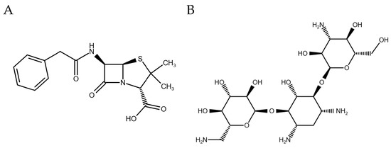 Chemical structures of (A) penicillin and (B) kanamycin.