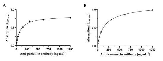 Affinity determination of (A) anti-penicillin G specific mAb against penicillin G-BSA conjugate and (B) anti-kanamycin specific mAb against kanamycin-BSA conjugate. For both, a microtiter plate was coated with respective antibiotic-BSA conjugate and remaining binding sites were blocked. Subsequently, antibody dilutions in the range from 9.76 ng·mL−1 to 1250 ng·mL−1 were applied and afterward labelled with mouse IgG-specific HRPO-conjugated secondary antibody. Absorbance was measured after 10 min of ABTS substrate incubation. n = 1.