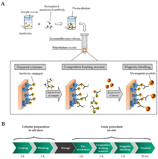 After successful generation of antibiotic-conjugates and the confirmation of high affinity binding of mAbs, first cMID experiments were performed. For this, biotinylated monoclonal antibodies are pre-incubated with antibiotics-containing samples. Afterward, the mixture is applied onto immunofiltration columns (IFC) containing antibiotic-carrier protein conjugate coated polyethylene matrices. While the sample is flushed through the IFC by gravity flow, a competitive binding reaction of biotinylated monoclonal antibodies between free soluble antigens in the sample and coated antigen-conjugates at the matrix takes place. Hence, non-saturated biotinylated antibodies are retained and subsequently can be magnetically labelled with streptavidin-functionalized superparamagnetic particles based on highly affine streptavidin-biotin reaction. Especially due to the comparable molecular weight and chemical properties of antibiotics and mycotoxins, coating concentration as well as antibody and magnetic particle concentration was adapted from intensive preliminary work of mycotoxin cMID assay development [23]. Additionally, each assay step was set to one hour, enabling full equilibrium of binding reactions. A schematic overview of cMID procedure is demonstrated in Figure 3A and assay times are presented in Figure 3B.