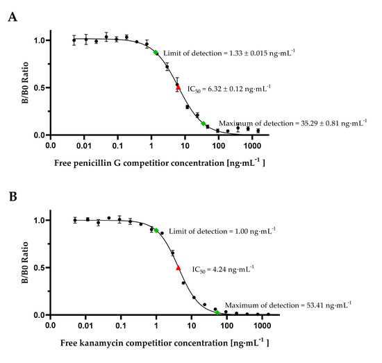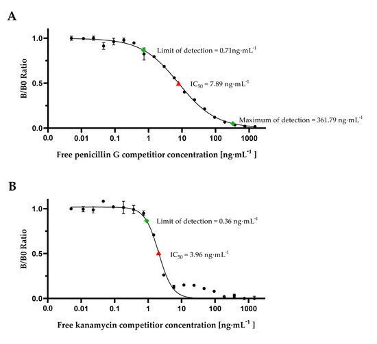 In our B0 measuring, maximum signals of both calibration curves were at approximately 500 mV. Based on Equation (4), a limit of detection of 0.71 ng·mL−1 for penicillin G and a LOD of 0.36 ng·mL−1 for kanamycin could be determined. An approximately 2-fold lower IC50-value for kanamycin with 3.96 ng·mL−1 in comparison to penicillin with 7.89 ng·mL−1 demonstrates a higher assay sensitivity. While for penicillin G a MOD of 361.79 ng·mL−1 was calculated according to Equation (3), this was not possible for kanamycin due to increasing B/B0 ratio of measuring signals in the range of 11.7 ng·mL−1 up to 93.7 ng·mL−1. However, for penicillin G it could be demonstrated that the dynamic range (0.71 ng·mL−1 up to 361.79 ng·mL−1) is greatly increased in comparison to commercially available test kits as EuroProxima Penicillin ELISA (r-biopharm, Darmstadt, Germany). For this ELISA-based assay, a calibration curve ranging from 0.125 ng·mL−1 up to 4 ng·mL−1 needs to be prepared which just covers the range of MRL for penicillin G. Hence, our results demonstrate an, in general, improved detection of penicillin G and kanamycin by employing our newly developed competitive magnetic immunodetection.