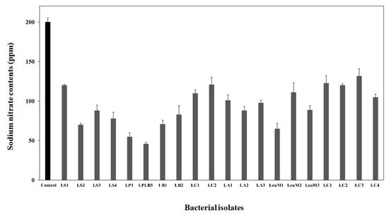 Eight hundred isolates of nitrate-tolerant microorganisms were isolated from different types of kimchi containing high nitrate concentrations. The isolates and kimchi LAB obtained from MGB were cultured in MRS broth supplemented with NaNO3, followed by a screening assay for nitrate reduction. Twenty microorganisms related to kimchi fermentation including Lactobacillus sakei (four strains), Levilactobacillus brevis (two strains), Lactiplantibacillus plantarum (two strains), Lb. alimentarius (three strains), Lb. curvatus (two strains), Leuconostoc mesenteroides (three strains), and Leu. citreum (four strains) with excellent nitrate reduction potential were selected. Measuring the nitrate content in the supernatant of the different cultures, isolate LPLB5 was selected as the strain with excellent nitrate reduction capabilities (Figure 1).