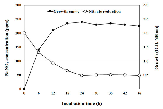 For this strain, it was observed that the initial nitrate concentration of 200 ppm decreased rapidly within the first 24 h and remained constant at 50 ppm for the next 24 h of cultivation. Furthermore, rapid growth could be observed within the first 12 h of incubation and the stationary phase was reached after 18 h (Figure 2).