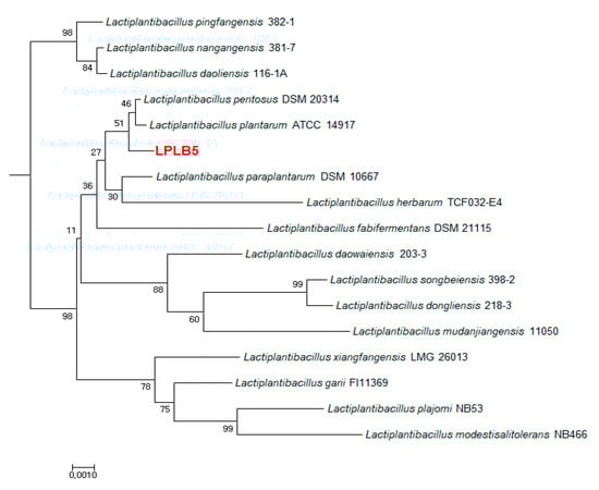 Neighbor-joining phylogenetic tree constructed based on 16S rRNA gene sequencing. The position of strain LPLB5 and its closest members of the genus Lactiplantibacillus were shown. Bootstrap percentages (≥30%) based on 1000 replications are given at the branch points. Bar, 0.01 substitutions per nucleotide position.