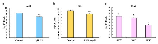 Acid, bile salt, and heat tolerance of LPLB5. The viable cells were counted after exposure to (a) pH 6.5 (control) or 2.5 for 4 h (b) without (control) or with 0.3% bile salt (oxgall) for 24 h and (c) 40, 50, and 60 °C for 1 h. The results represent the mean ± SEM, with n = 3. *** (p < 0.001) indicates a significant difference vs. control. The different letters on the error bars indicate statistically significant differences between the groups (p < 0.05).