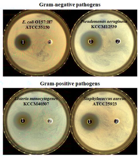 Antibacterial activity of LPLB5. 1, culture supernatant of LPLB5; 2, MRS broth as control. Antibacterial activity of culture supernatant of LPLB5 against E. coli O157:H7, p. aeruginosa, Leu. monocytogenes, S. aureus using the agar well diffusion assay. Four pathogenic bacteria were spread on tryptic soy agar (TSA) plates, then 120 μL of culture supernatant was added to the wells, previously punched into the agar. The plates were incubated at 37 °C for 24 h.