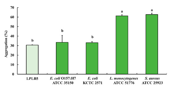 Auto- and co-aggregation ability of LPLB5. The absorbance of the bacterial suspension at was measured at 600 nm and that of the upper phase was measured at 600 nm again after incubation at 37 °C for 4 h. The results represent the mean ± SEM, with n = 3. The different letters on the error bars indicate statistically significant differences between the groups (p < 0.05).