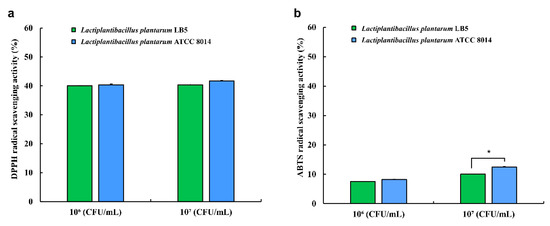 To evaluate the antioxidant capacity of LPLB5, DPPH radical- and ABTS radical-scavenging analyses were performed (Figure 7). The results showed that LPLB5 had DPPH radical-scavenging activity of 40%; there was no significant difference between the DPPH radical-scavenging activities with 106 and 107 CFU/mL of LPLB5 (Figure 7a). An established probiotic strain, L. plantarum ATCC 8014, showed a DPPH radical scavenging activity similar to that of LPLB5. At 107 CFU/mL, both LPLB5 and L. plantarum ATCC 8014 had ABTS radical-scavenging activities of about 10% (Figure 7b), with that of L. plantarum ATCC 8014 being significantly higher.