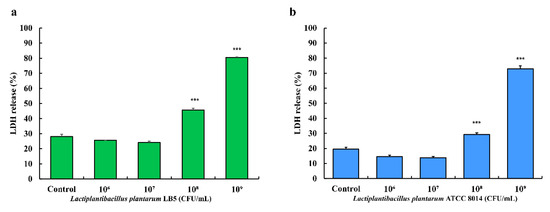 Effects of (a) LPLB5 and (b) L. plantarum ATCC 8014 on lactate dehydrogenase (LDH) release from human colon epithelial cells (Caco-2) cells. The Caco-2 cells were treated with LPLB5 or L. plantarum ATCC 8014 (106, 107, 108, and 109 CFU/mL) for 24 h. The results represent the mean ± SEM, with n = 3. *** indicates a significant difference vs. control (*** p < 0.001).