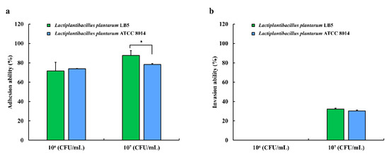 (a) adhesion and (b) invasion of LPLB5 and L. plantarum ATCC 8014 in Caco-2 cells. The Caco-2 cell were treated with LPLB5 or L. plantarum ATCC 8014 (106 and 107 CFU/mL) for 2 h at 37 °C. For the invasion assay, the cells were then incubated for a further 2 h with gentamicin. The viable cell counts were enumerated before and after incubation. Results represent the mean ± SEM, with n = 3. * indicates a significant difference vs. control (* p < 0.05).