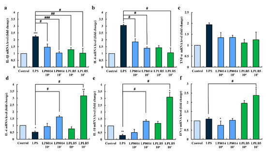 The mRNA levels of three pro-inflammatory cytokines increased following LPS challenge (Figure 10a–c). However, the levels of IL-1β and IL-6 were significantly decreased when the cells were pretreated with 106 and 107 CFU/mL of LPLB5 or L. plantarum ATCC 8014 (Figure 10a,b). In addition, the expression levels of TNF-α showed a decreasing trend in response to the pretreatment with LPLB5 and L. plantarum ATCC 8014 (Figure 10c). The mRNA levels of anti-inflammatory cytokines IL-4, IL-10, and IFN-γ were upregulated in LPS-treated Caco-2 cells pretreated with 107 CFU/mL of LPLB5 (Figure 10d–f).