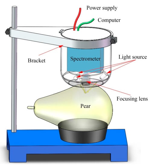 A VIS/NIR system was established for spectral measurement, as shown in Figure 1. The system mainly consisted of the light source, the spectrometer and the lifting bracket. The illumination unit consisting of three 5-watt halogen lamps (998070-1, Welch Allyn, Skaneateles Falls, NY, USA) and was adjusted at an angle of approximately 45° to prove a unit lighting. The spectrometer is the core part of the detection system. In this study, a VIS/NIR spectrometer (STS-NIR, Ocean Optics, Largo, FL, USA) with a range of 650–1100 nm and a resolution of 6 nm was used. A coated quartz lens (74-UV, Ocean Optics, Largo, FL, USA) was coupled to the front of the spectrometer. The diameter of the focusing lens is 5 mm and the focal length is 10 mm, which can converge the light to the entrance of the spectrometer to achieve a larger photosensitive range. A self-designed lifting bracket was used to fix the spectrometer and light source, providing the advantage of avoiding ambient light interference. The optical sensing system can achieve the acquisition of visible−near-infrared spectra from 650 to 1100 nm. The spectrum of this region has a deeper sample penetration and recorded many hydrogen-containing compound absorption bands, such as the starch, pectin and the moisture content [,]. When collecting the spectra of pears, we first put the pear on the sample tray, and then adjusted the height of the bracket to make the focusing lens close to the surface of the sample. We then set the integration time to 0.01 s and the average number to 5 times. The above operation was repeated three times accompanied by rotating the sample 120 degrees. The spectrum was expressed as transmittance (T%) using Equation (1).
