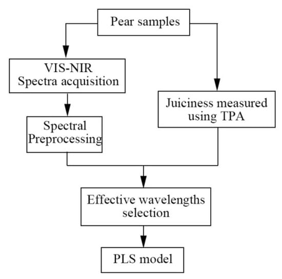 Visible−near-infrared (VIS/NIR) spectroscopy is an optical detection method, which has the advantages of being fast, non-destructive and convenient. In previous studies, many scholars predicted the internal quality of pears based on VIS/NIR spectroscopy []. Fan et al. [] established prediction models (400–1000 nm) of soluble solids content(SSC) and firmness with the root mean square error of 0.491 and 0.721, respectively. Li et al. [] applied partial least squares regression to establish a prediction model for sugar content of pear based on the three different wavelength ranges, with a determination coefficient of 0.92 and a root mean square error of 0.2%. Although there are no publications focusing on the detection of the juiciness of pear using non-destructive VIS/NIR spectroscopy, the juiciness of some other fruits (e.g., apples and peaches) were analysis by the spectroscopic method. Arefi et al. [] classified fresh and mealy apples, which were identified by stiffness and juiciness based on biospeckle imaging. Mehinagic et al. [] investigated the relationships between sensory attributes and non-destructive VIS/NIR spectroscopy. They indicated that there is a statistically significant relationship between VIS/NIR wavelengths and juiciness of apple, especially in the ranges of 670–710 and 920–950 nm. These results are in agreement with those of Watada et al. []. Baltazar et al. [] evaluated the juiciness of more than 2000 fruits and established the prediction model based on VIS/NIR wavelengths in the ranges of 896–1684 nm. The coefficients of correlation were 0.86 and 0.83 for peaches and nectarines, respectively.