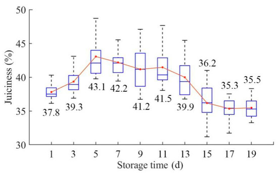 The juiciness distributions of pears during the whole storage period are shown in Figure 3. With an increase in the storage time, the average juiciness tended to rise first and then decrease. The average juiciness of pears reached its highest value on the fifth day. After the fifth day, the fruit began to decay and the intercellular fluid was lost, resulting in a decrease in juiciness and flavor. This change was similar to the research conclusion of Hohn et al. []. This trend may be determined by the combined effect of the increase in soluble substances caused by the degradation of starch and pectin in the early storage period and the continuous decrease in moisture content caused by the volatilization of water [,,]. In addition, the changing regularity of juiciness may vary in different storage environments [].