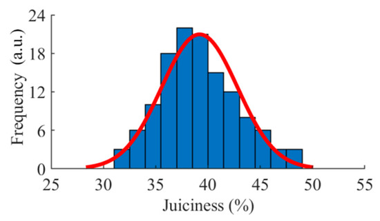 The juiciness content of 127 pears covered 31.18 to 48.71%. As shown in Figure 4, the concentration of the sample was approximately in accordance with the normal distribution. Ten samples were randomly selected every day as modeling samples (a total of 100 pears), and the remaining were used for external verification (a total of 27 pears). The juiciness distribution of the calibration set and the external verification set are shown in Table 1.