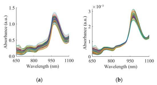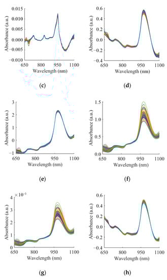 Typical absorbance spectra for the pears showed a number of clear absorption peaks (Figure 5a). For different storage periods, similar peaks can be observed at the wavelengths of 675, 740, 840 and 975 nm. From 650 to 700 nm, there was a decrease in absorbance with a small peak at about 675 nm, which was related to the absorption of chlorophyll in pears [,]. The absorbance of the peak here was determined by the content of chlorophyll in the sample. After the trough at 700 nm, there was a continuous increase in absorbance; the second and the third peak appears around 740 and 840 nm, respectively. The peaks here were related to the absorption of water and carbohydrate. Due to the combined effects of -OH (940 nm) and water (980 nm), the strongest absorption band exists at ~975 nm []. In general, a considerable baseline offset was observed in the 650–1100 nm region. In addition, different preprocessing spectra showed similar results in which the same absorption peaks were observed, as shown in Figure 5.