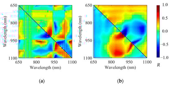 The spectral correlation after (a) orthogonal spatial projection combined with spectral ratio (OPS-SR) and (b) linear regression correction combined with spectral ratio (LRC-SR).