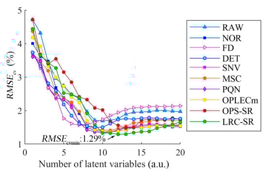 The prediction model of juiciness in pear samples was established by the PLS method based on the different preprocessing spectrum, and the root mean square error of Monte Carlo cross-validation was used to determine the number of number of latent variables, as shown in Figure 7.