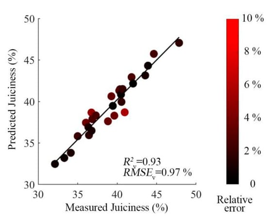 LRC-SR still showed the best prediction accuracy: the determination coefficient of external verification (R2v) was 0.93, and the root mean square error of external verification (RMSEv) was 0.97%. The results of OPS-SR were also acceptable, but from the scatter plot, the result shows that the linearity of the model and the prediction errors for juiciness content were lower and larger than the prediction value of the LRC-SR method, respectively. In general, the accuracy of the external verification of the prediction set was encouraging. However, the performance of other preprocessing methods, such as that of the NOR and PQN method, was not satisfactory due to the failure in elimination of the light-scattering effects in the raw spectra. The scatter plots of the juiciness predicted by LRC-SR combined with the CARS method and measured juiciness are shown in Figure 8, and the relative deviation of each sample was color-coded.