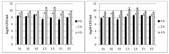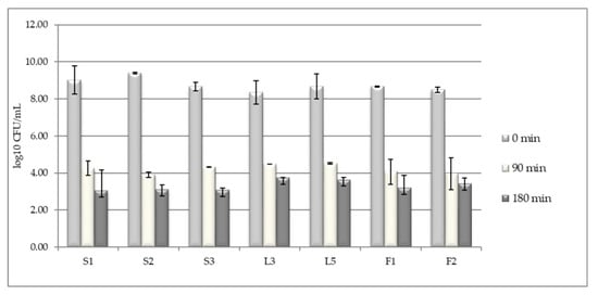In the intestinal tract, the potential probiotic microorganisms, should tolerate the environmental conditions found in the superior part of the tract, where the pH is very acidic and the pepsin is present. In our study, conducted on a pH of 2.5 and in the presence of 0.3% pepsin, it was noticed that, after 90 min exposure, the viable cell levels substantially decreased from 108–109 CFU/mL to 104 CFU/mL. After a longer exposure, of 90 cultivation minutes (a total of 3 h), the population level decreased with other one logarithmic unit, to 103 CFU/mL (Figure 1).) Isolates like L3, L5, and F2 have better adapted to a very acidic medium than the other isolates.