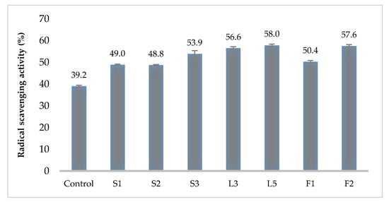 Regarding antioxidant activity, the control (MRS media without any inoculum) reached a 39.2% radical scavenging activity. The Kombucha LAB isolates radical scavenging activity varied between 48.8% and 58.0%. Significant differences (p ≤ 0.05) were noticed between Control and all LAB tested isolates. No significant differences were observed between the isolates L5 (58%), F2 (57.6%), and L3 (56.6%), which showed the highest antioxidant activity (Figure 3).