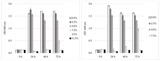 Tolerance to different NaCl concentrations of Kombucha L3 (left) and L5 (right) LAB isolates. Data shown are mean ± SD of triplicate values of independent experiments.