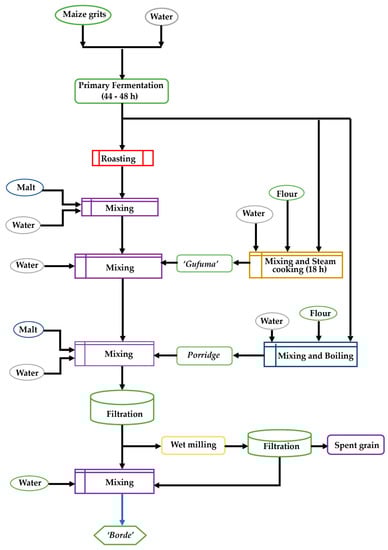 The Borde making process starts with germinating barley grain by following the same procedure described for the Tella malt preparation process. This malt, a source of amylase enzymes, is ground to become a malt flour []. In parallel, maize grits are mixed with a proportional volume of water and fermented for about 44 to 48 h (Figure 1). The fermented blend is divided into three portions. Similar to Uganda’s kwete [], about 40% of the blend is roasted on a hot pan and a bread locally called “Enkuro” is produced. Then, the prepared “Enkuro” is mixed with malt flour and additional water and allowed to ferment for about 24 h in the same mixing tank []. The other 40% of the fermented maize grits are mixed with additional fresh maize flour and water. This mixture is shaped into a ball-like structure and cooked using steam to form “Gafuma” []. Subsequently, “Gafuma” is added to previously prepared “Tinsis” to become the thick brown mash called “Difdif” []. The remaining 20% of the fermented maize grits are mixed with additional flour and water and boiled to form thick porridge. Then, the prepared porridge, extra malt, and water are mixed into the earlier produced “Difdif”. Finally, the mixture is filtered and a small amount of water is added before serving to consumers as the final product Borde [].