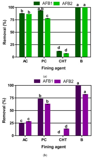Figure 1. Removal of aflatoxins B1 (AFB1) and B2 (AFB2) in white (a) and red wine (b) using different fining agents. Means within a column for each wine, followed by the same letter are not significantly different (Tukey p < 0.05). AC—Activated Carbon; PC—Potassium Caseinate; CHT—Chitosan; B—Bentonite.