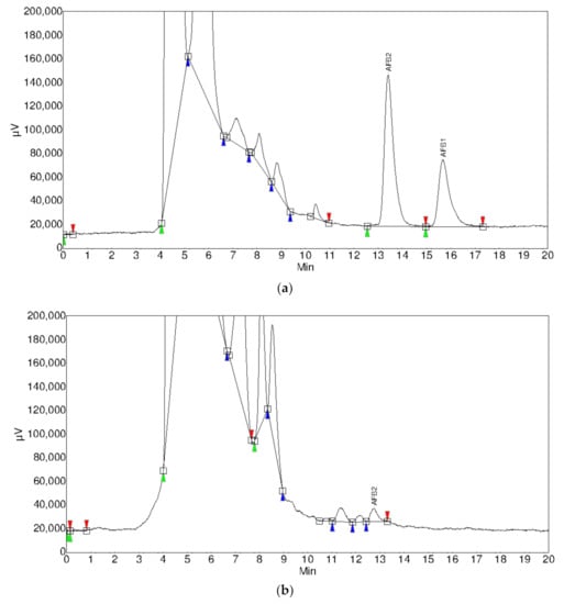 Figure 2. Chromatograms showing the content of aflatoxins B1 and B2 in (a) control red wine and (b) after treatment with 120 g/hL of bentonite.
