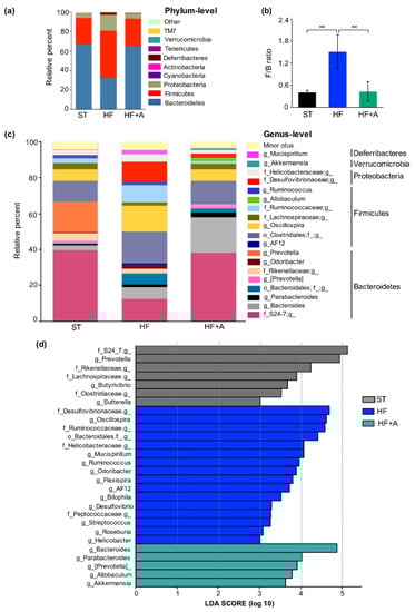 Differences in relative abundance of bacterial taxa in mice fed with high-fat diet plus agavins supplementation. (a) Bacterial taxa plot at the phylum level. (b) Firmicutes/Bacteroidetes ratio. Data are shown as average ± SD, and were analyzed using one-way ANOVA, followed by Tukey multiple comparison test. Significant difference is indicated by ** p < 0.01. (c) Bacterial taxa plot at the genus level. Each taxa > 1% of the average relative abundance in groups is indicated by a different color. Taxa are reported at the lowest identifiable level, indicated by the letter preceding the underscore: f, family; g, genus. (d) Histogram of biomarker bacteria in each group. Linear Discriminant Analysis (LDA) Effect Size (>3.0 fold) was used to determine statistically significant biomarkers. HF (mice fed with a high-fat diet); HF+A (mice fed with a high-fat diet plus agavins); ST (mice fed with a standard diet); for each experimental group (n = 5).