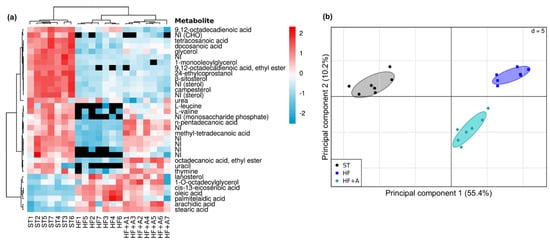 Fecal metabolites differences after agavins consumption. (a) Heat map of differential metabolites found in the feces of mice. NI (Not Identified); Colors (red, relative increase; blue, relative decrease; black, absence metabolite). (b) PCA plot showing separated clusters between the different treatments. Mahalanobis distance (Md) and Hotelling’s T2 test were calculated to measure and confirm the difference between every pair of clusters (ST vs. HF: Md = 372.8, p = 1.33 × 10−9; ST vs. HF+A: Md = 219.4, p = 9.89 × 10−11; HF vs. HF+A: Md = 91.3, p = 3.63 × 10−6). HF (mice fed with a high-fat diet); HF + A (mice fed with a high-fat diet plus agavins); ST (mice fed with a standard diet); for each experimental group (n = 7).