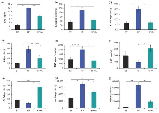 Agavins consumption decreased LPS and pro-inflammatory cytokine levels as well as insulin and leptin hormones in mice fed high-fat diet. (a) Concentration of LPS; (b) IL-1α; (c) IL-1β; (d) IL-6; (e) TNF-α; (f) IL-10; (g) GLP-1; (h) Insulin; and (i) Leptin. Data are shown as average ± SEM (n = 6/group). Data were analyzed using one-way ANOVA, followed by Tukey multiple comparison test. Significant difference is indicated by * p < 0.05, ** p < 0.01 and *** p < 0.001; near-significant differences are also reported. HF (mice fed with a high-fat diet); HF+A (mice fed with a high-fat diet plus agavins); ST (mice fed with a standard diet).