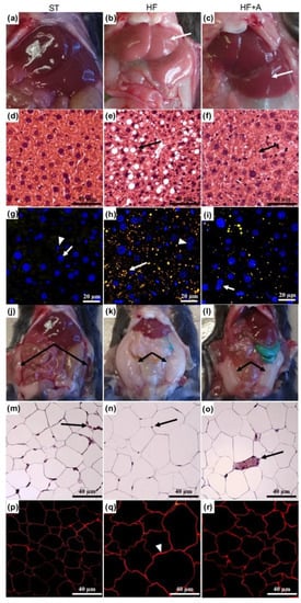 Agavins supplementation reduced hepatic steatosis and lipid droplets content as well as the amount of adipose tissue and adipocyte size in mice fed high-fat diet. (a–c) Representative images of liver after consumption of the different diets; (d–f) Histopathological examination of mouse livers by hematoxylin and eosin staining; (g–i) Accumulation of lipid droplets in the mouse livers. Lipid droplets were stained with red Nile (yellow) and nucleus with DAPI (blue); and analyzed using a multiphoton microscope system. (j–l) Representative images of adipose tissue present in the mice after the intake of the different diets; (m–o) Histopathological examination of adipocyte size using hematoxylin and eosin staining; (p–r) Adipocytes stained with red Nile. HF (mice fed with a high-fat diet); HF+A (mice fed with a high-fat diet plus agavins); ST (mice fed with a standard diet).