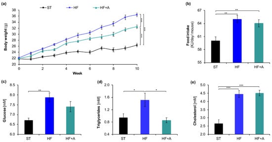 Agavins supplementation reduced body weight gain, food intake, glucose and cholesterol levels in mice fed high-fat diet. (a) Body weight evolution; (b) Food intake; (c) Glucose; (d) Triglycerides; (e) Cholesterol levels in blood. Data are shown as average ± SEM (n = 7/group). Data were analyzed using one-way ANOVA, followed by Tukey multiple comparison test. Significant difference is indicated by * p < 0.05, ** p < 0.01, *** p < 0.001. HF (mice fed with a high-fat diet); HF+A (mice fed with a high-fat diet plus agavins); ST (mice fed with a standard diet).