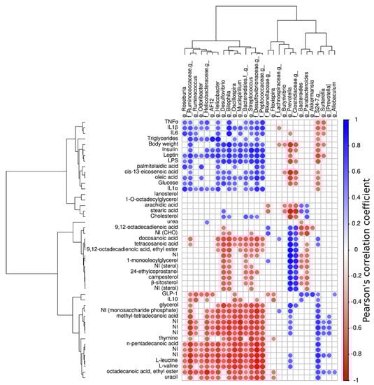 Correlogram showing only significant Pearson’s correlations between key bacterial genera and metabolites, inflammatory biomarkers, hormones, and systemic effects. Blue circles denote a positive correlation while red ones denote a negative correlation.