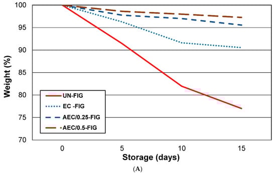 The weight loss percentage is reported in Figure 1A. Control fruits (UN-FIG) showed the highest weight loss, while the lowest fresh mass loss was exhibited by AEC/0.25-FIG and AEC/0.5-FIG and, although to a lesser extent, by the EC-FIG samples, showing a weight loss percentage equal to approximately 9%. Weight loss of the control fruits increased gradually during the storage period due to the migration of water from the fruits to the environment, possibly attributed to the transpiration and direct evaporation through the epidermal cells [26]. In coated fruits, weight loss was reduced, suggesting that its composition promotes the formation of a network on the fruit surface which is able to contain the water loss.