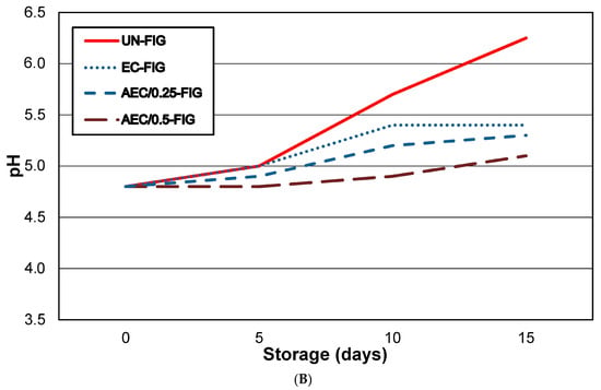 EC-FIG and EC-FIG with 0.25% and 0.50% of PPE showed pH values on the 15th day of storage similar to fresh figs at day 0.
