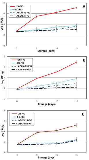 The microbiological data are reported in Figure 2A–C, showing a continuous increase in the microflora population in the UN-FIG samples. In detail, the total mesophilic microflora (TMC) developed throughout a storage time of 7.1 Log10 UFC/g, with an initial TMC value of 2.5 Log10 UFC/g in UN-FIG. The same trend was shown by yeast and mold populations and also total bacterial coliforms (reported in the Figure as the Enterobacteriaceae family). This behavior may be related to the ability of the aerobic and facultative anaerobes microorganisms to present as components of the indigenous fig microflora that can grow in high and low levels of O2 or high levels of CO2. Our experimental data were in accordance with other studies [7]. In the EC-FIG, AEC/0.25-FIG, and AEC/0.5-FIG groups, the various microbial groups showed lower population loads, with TMC values of 2.6 Log10 UFC/g at 0 day and 3.7–3.0 Log10 UFC/g at day 15. The yeast and mold values were 1.8 Log10 UFC/g at 0 day and 3.8–2.2 Log10 UFC/g at 15 days, and Enterobacteriaceae exhibited values of 1.5 Log10 UFC/g at 0 day and 2.4–2.2 Log10 UFC/g at 15 days. We assumed that the indigenous fig microflora did not find suitable conditions to grow during storage, as suggested also from other authors [7]. This different growth capability could be the direct consequence of the technological characteristics of the edible coating and the experimental conditions. In particular, in AEC/0.25-FIG, AEC/0.5-FIG samples, the percentages of active components with antimicrobial proprieties [9] influenced the microflora growth. Both AEC/0.25-FIG and AEC/0.5-FIG samples showed minimal increases in TMC, yeast, molds, and total coliform bacteria after ten days, less than one logarithmic order, perhaps due to the decrease in PPE antimicrobial efficiency. These data confirmed that coating application with antimicrobial characteristics could enhance the microbial safety of fruits [28].