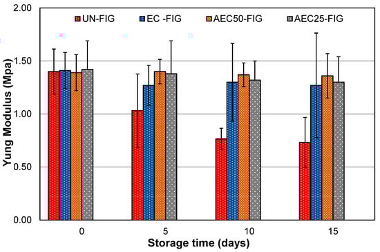 After five days (Figure 3), UN-FIG showed a strong diminution of the compression strength, while EC-FIG still maintained a very high strength. The most significant results were obtained in AEC/0.25 and AEC/0.50 after 15 days of storage. In both groups, the mechanical strength was practically unchanged respective to the initial values.