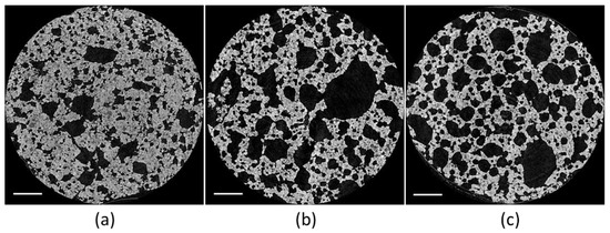 Cross-sections of cookie samples produced with recipes R1 (a), R2 (b), and R3 (c) (Table 1). The scale bars correspond to 800 µm. Increasing porosity can be noticed with higher baking powder concentration.