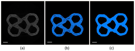 Representation of the image processing step for a honeycomb structure with cell size of 10 mm and wall thickness of 1.3 mm (H4): (a) cross-section of the original reconstructed volume, (b) automatic thresholding, (c) results of the “remove small holes” filter. The scale bars correspond to 5 mm.