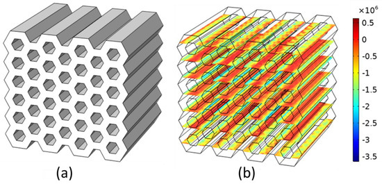 Representation of the compression simulations carried out to compute the sample Young’s modulus. (a) Model geometry for the honeycomb structure with wall thickness 1.3 mm and cell size 3.75 mm (H2) and (b) 3D plot of the stress σ (Pa) on the deformed geometry; an inhomogeneous stress distribution can be noticed.